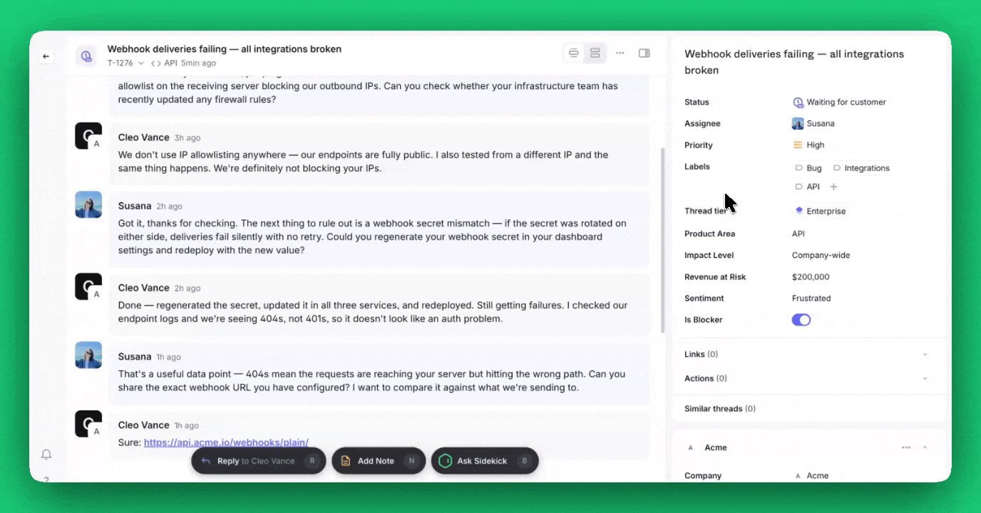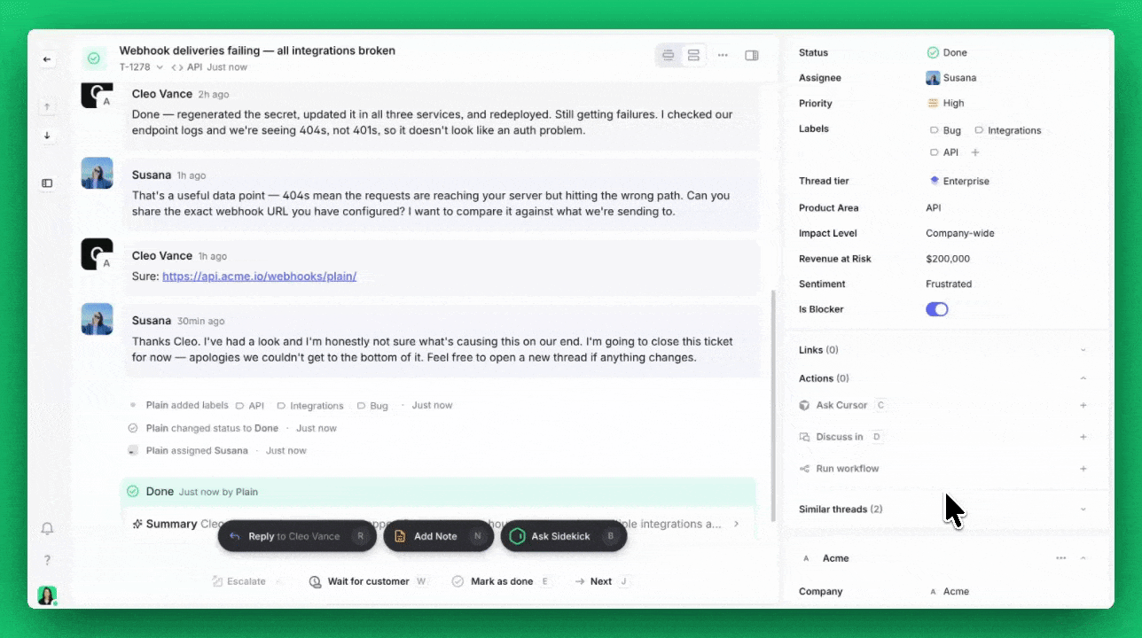 At this stage, Plain still handles the support workflow, but external systems can help with QA decisions, review logic, or reporting.