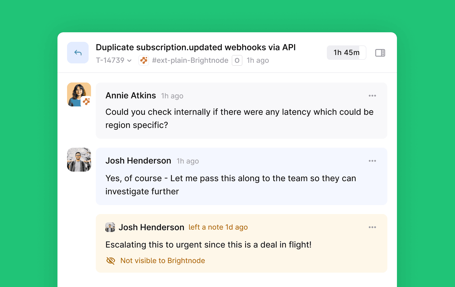 “This is work, but it’s not really a thread.” - Internal actions like account changes, billing checks, or operational follow-ups now have a home next to your support work.