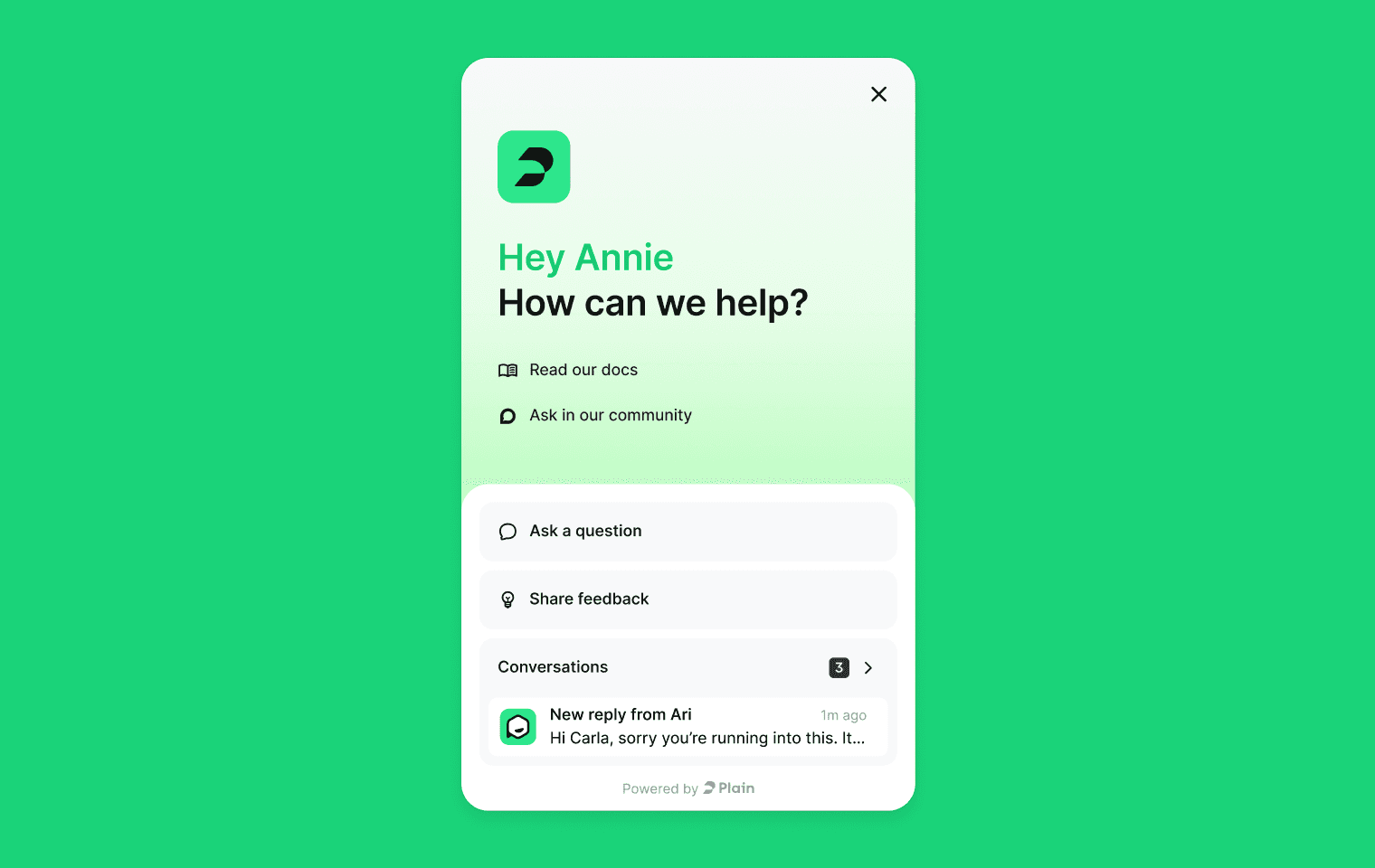 Show agent status to users -- when enabled, customers can see when an AI agent is actively handling their conversation, including the agent's name and avatar. Works with both Ari and your own AI agent.