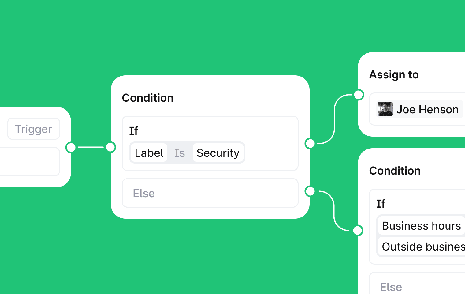 Chain actions together: assign threads, set priority, send messages, apply labels, add notes, or fire HTTP requests to external services. Wait steps let you pause for minutes, hours, or days, and cancel early if something changes, like the customer replying.