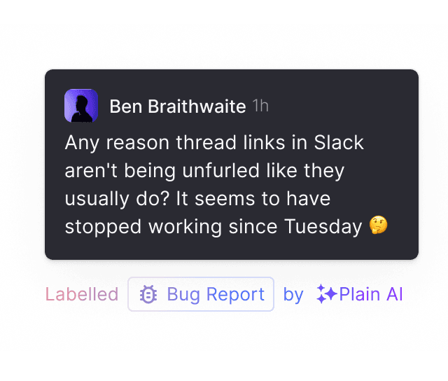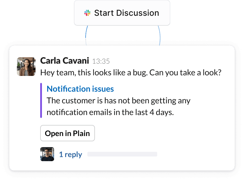 Share and discuss customer issues in any internal Slack channel and get notified once discussions are resolved — without ever leaving Plain.