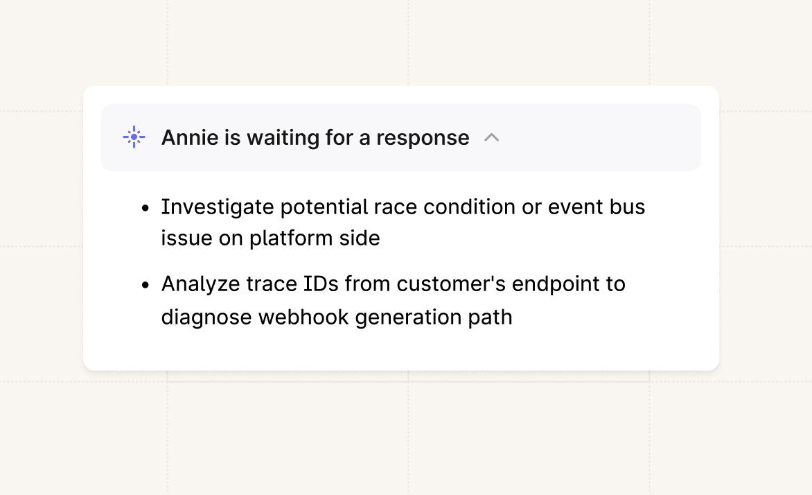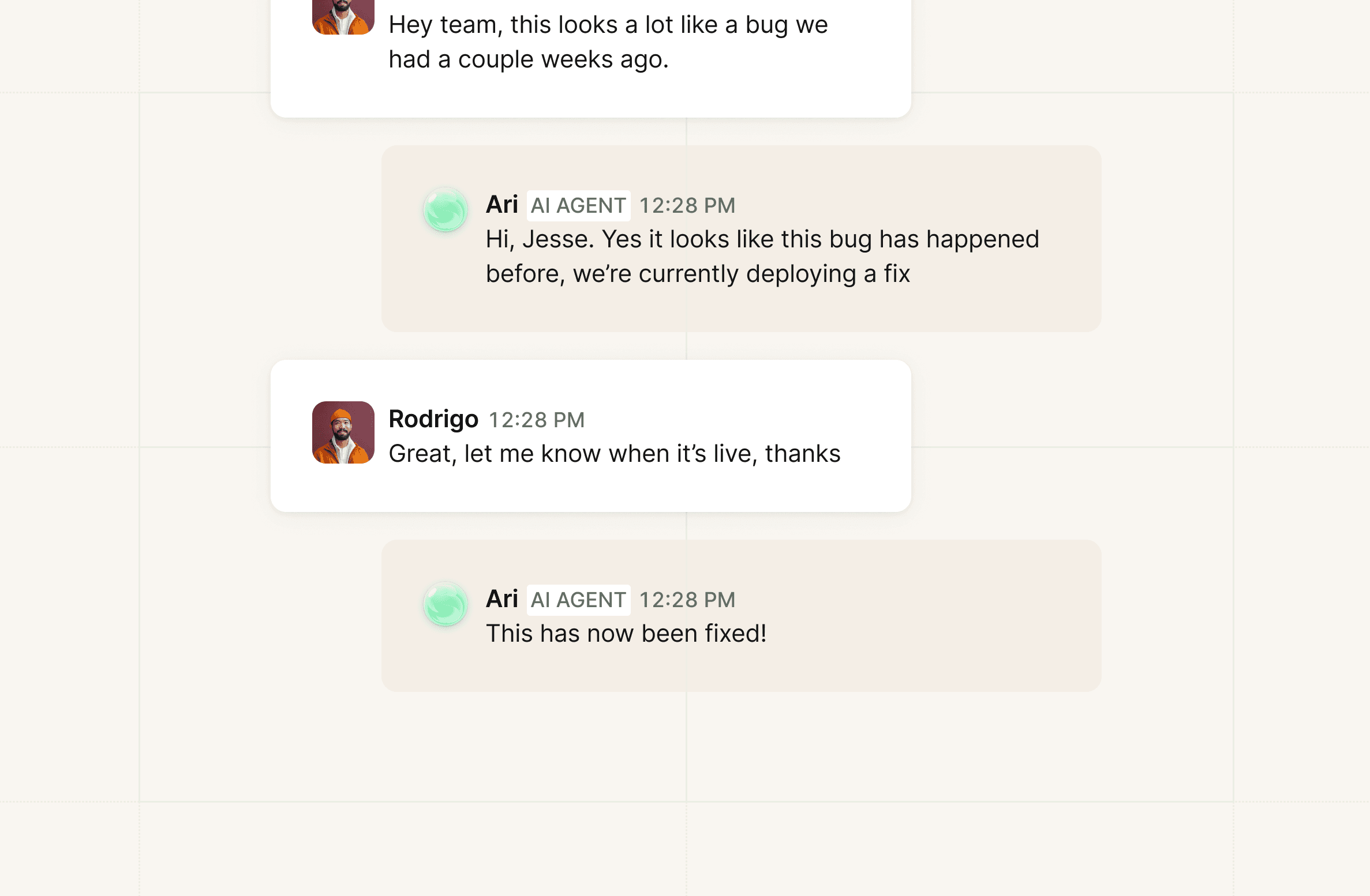 Ari helps triage requests, investigate issues, and assist your team using the knowledge your team has already built.